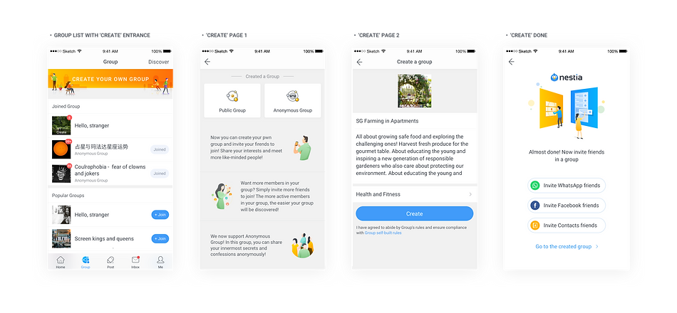 I led the design from start to finish, collaborating closely with PM, engineers to scope and design the group experience in the past half years. I worked on user research, sketches, wireframes, prototypes and visual design.